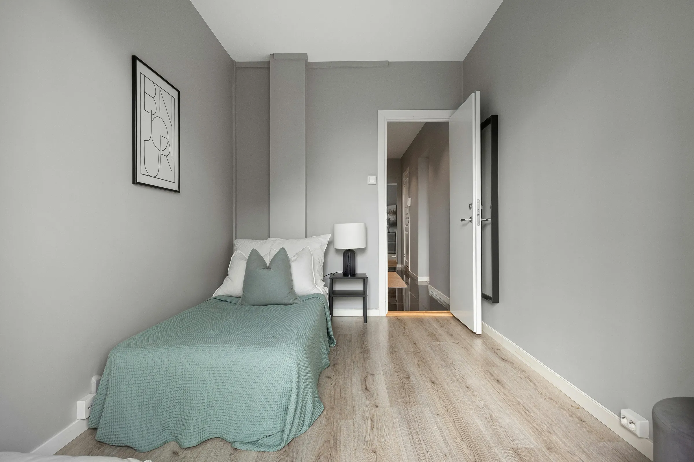 Modern living room with green sofa and brick wall.